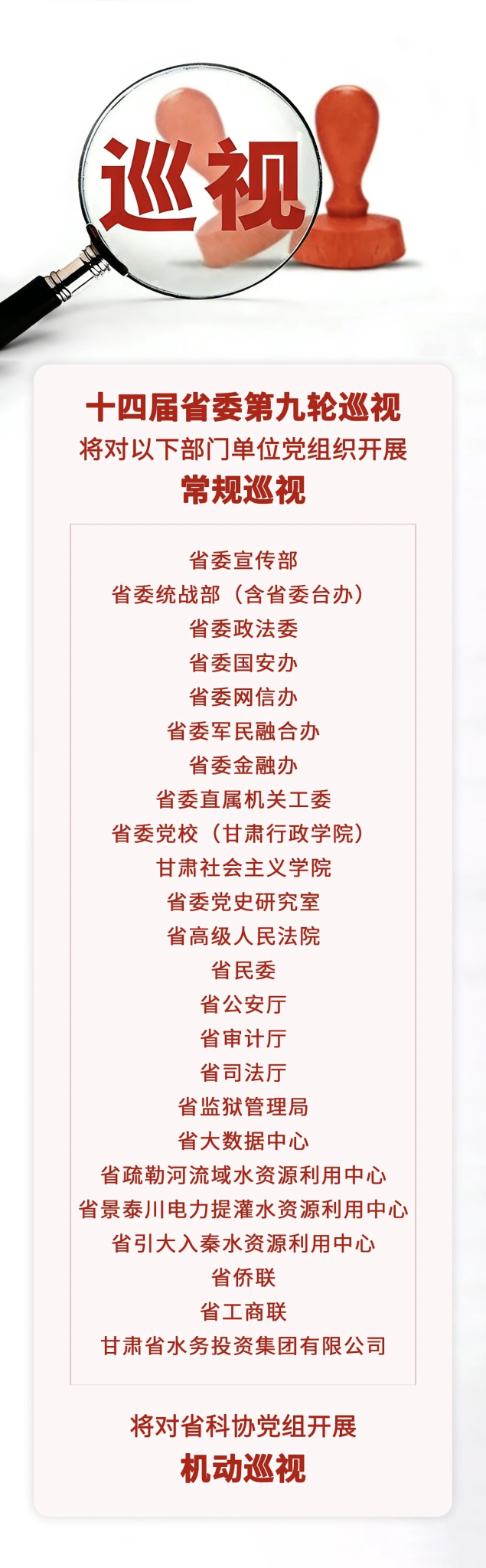 本网甘肃讯(臧秀娟)从3月23日召开的十四届甘肃省委第九轮巡视动员部署会上获悉,根据省委巡视工作统一部署,十四届省委第九轮巡视将对省委宣传部、省委统战部(含省委台办)、省委政法委、省委国安办、省委网信办、省委军民融合办、省委金融办、省委直属机关工委、省委党校(甘肃行政学院)、甘肃社会主义学院、省委党史研究室,省高级人民法院,省民委、省公安厅、省审计厅、省司法厅、省监狱管理局、省大数据中心、省疏勒河流域水资源利用中心、省景泰川电力提灌水资源利用中心、省引大入秦水资源利用中心,省侨联、省工商联,甘肃省水务投资集团有限公司等部门单位党组织开展常规巡视,对省科协党组开展机动巡视。