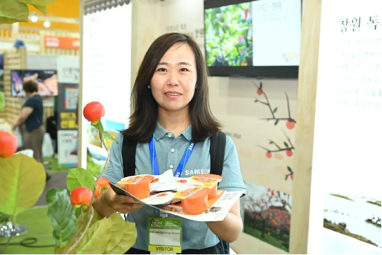 2023“村带头人访韩”活动期间,杨维娜参观农博会柿子深加工产品
