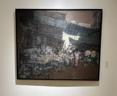 在构图上,许丙屯游刃有余地调度,以平视取景,铺排物象,带观者进入一种富于情感的现代观察视角。街道、建筑、行人、车架、杂货、遮阳棚等,在暗红色的基底与金色的光影中达成一种时间的叠化。画笔与画布摩擦产生的肌理效果,让物象质感丰富,墟市所延续的历史,不竭的生命力以及向上向善的精神都在画面中得以贯穿。观众由此进入对过去的怀思,对当下的凝视,再走向对未来的想象。