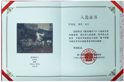 能够从全国海量的投稿中杀出重围,入选这个竞争激烈程度堪称“千军万马过独木桥”的国家级展览,本身就是对许丙屯艺术造诣最权威的认证。 那一纸沉甸甸的入选证书,不仅是对《最美烟火气》这幅作品的高度肯定,更是许丙屯跻身当代中国油画界顶尖行列的响亮宣告。在这份汇聚了三年精华的入选名单上,每一个名字都代表着一种艺术探索的高度,而许丙屯的名字,正以其独特的光芒闪耀其中。