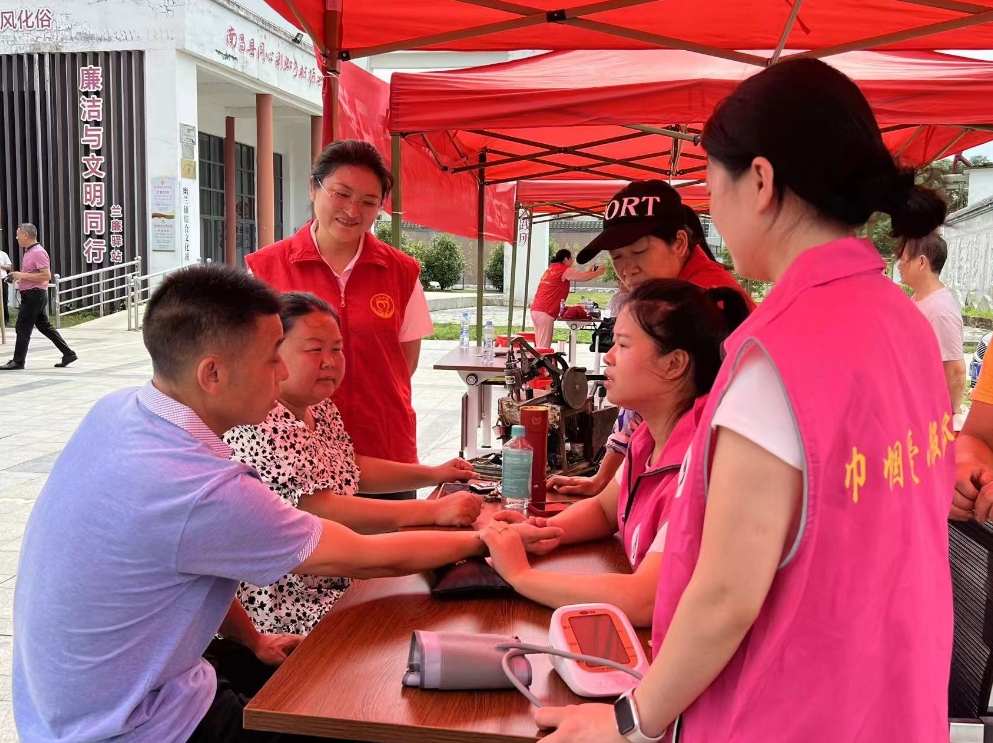 图为巾帼服务队为群众测量血压并提醒健康注意事项