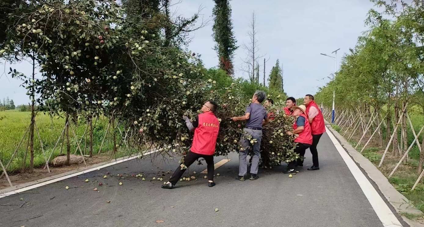 图为党员先锋服务队正在清理因暴雨导致倾倒的树木枝杈