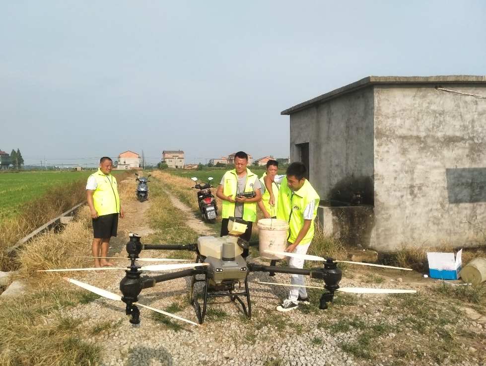 图为产业发展服务队正在使用农业无人机为群众喷洒药剂