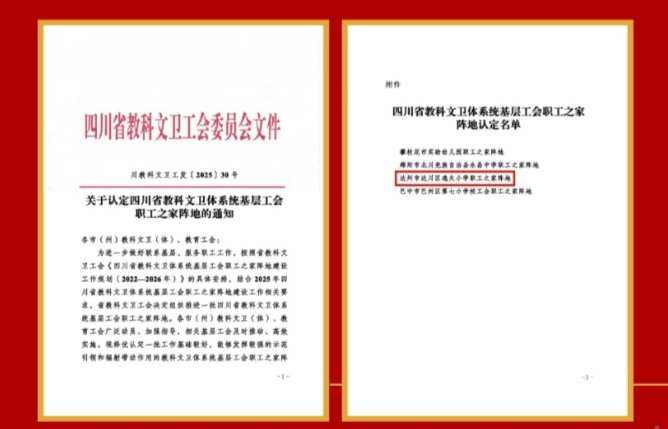 本网四川达州讯(杜靖宇 观理 报道)近日,从四川省教科文卫工会委员会传来重磅喜讯—达川区逸夫小学工会委员会成功获评“四川省教科文卫工会委员会职工之家阵地”认定名单!也是此次达州市唯一一所学校获此殊荣。这份省级荣誉,是上级部门对我校工会工作的最高肯定,更是全体逸夫教职工同心筑家、聚力实干的生动写照。