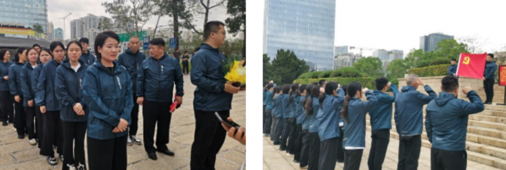 下午,队伍怀着崇敬之心,前往深圳首个国家级烈士纪念设施——孖岭革命烈士陵园,开展庄重肃穆的缅怀祭扫与政治学习活动。陵园内松柏苍翠、气氛庄严肃穆,大家整齐列队,向革命烈士纪念碑鞠躬默哀,深切缅怀为民族独立、人民解放和国家发展英勇献身的英烈。随后,全体党员佩戴党徽,面对鲜红党旗高举右拳,重温入党誓词,铿锵有力的誓言回荡在陵园上空,进一步坚定了不忘初心、牢记使命的理想信念。