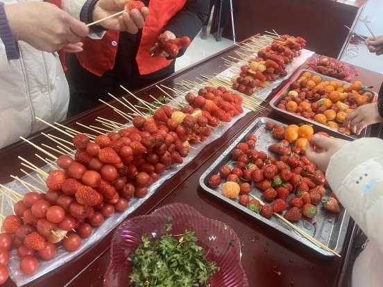 活动开始,社区工作人员向大家介绍了糖葫芦的历史渊源与制作技巧,从山楂、草莓、圣女果等食材的挑选,到熬糖的火候把控、裹糖的手法要领,细致讲解让居民们听得津津有味。随后,在志愿者的指导下,大家纷纷动手,将洗净的水果、坚果等食材有序串在竹签上,小心翼翼地裹上熬制好的糖浆,等待糖浆冷却凝固。