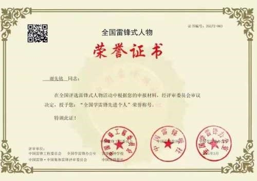 2021年3月谢先铭先生被全国学雷锋办公室等单位授予“全国学雷锋先进个人”荣誉称号。