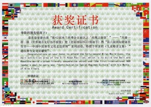 谢先铭先生著《九真精舍文集》被 2015 年米兰世博会授予“道医养生文化贡献奖”。