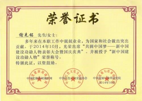 2014年10月份,中国党建新闻调查网和中国红色文化交流协会及中国发展与改革研究院联合授予谢先铭先生“新中国建设功勋人物”的荣誉称号,同时还颁发了荣誉奖章和荣誉证书。