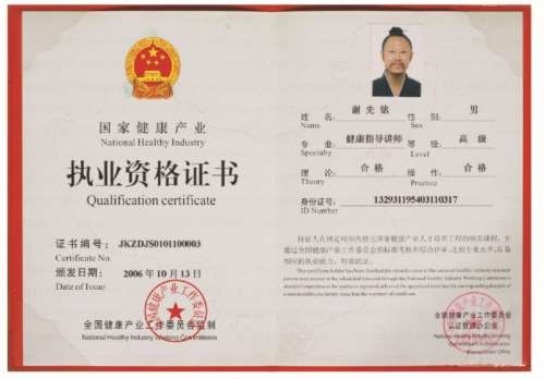 颁发了《国家健康产业执业资格证书》,专业:高级健康指导师讲师。