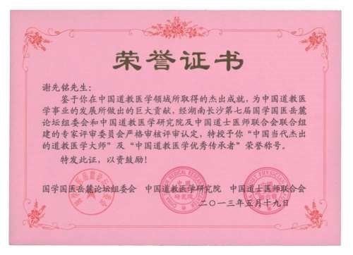 2013年5月19日,湖南省一年一度的“国学国医岳麓论坛组委会和香港中国道教医学研究院及香港中国道士医师联合会”为谢先铭医师授予了“中国当代杰出的道教医学大师”和“中国道教医学优秀传承者”的荣誉称号。