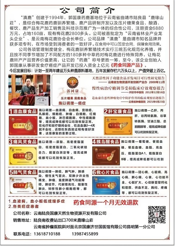 “滇鹿”创建于1994年,郭国康药鹿基地位于云南省曲靖市陆良县“鹿缘山莊”,是综合梅花鹿药鹿驯养繁殖、鹿产品研制开发以及压片糖果食品、酿酒、餐饮、鹿产品生产加工销售及科技示范推广为一体的综合性公司,注册资金6880万元,占地160亩,现有梅花鹿2800多头。公司被首批定为“云南省林业产业龙头企业”、是云南梅花鹿协会会长单位。公司品牌“滇鹿”是曲靖市知名品牌并获多项专利,在市场受到消费者的一致好评。在食用中可以签定合同,保障食用效果。