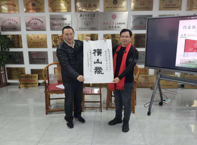中国萧军研究会书记、副会长梁海春挥毫泼墨祝贺“著名作家毛文轩(土牛)携畅销长篇小说《横山猎》做客《作者面对面》分享会圆满成功!”