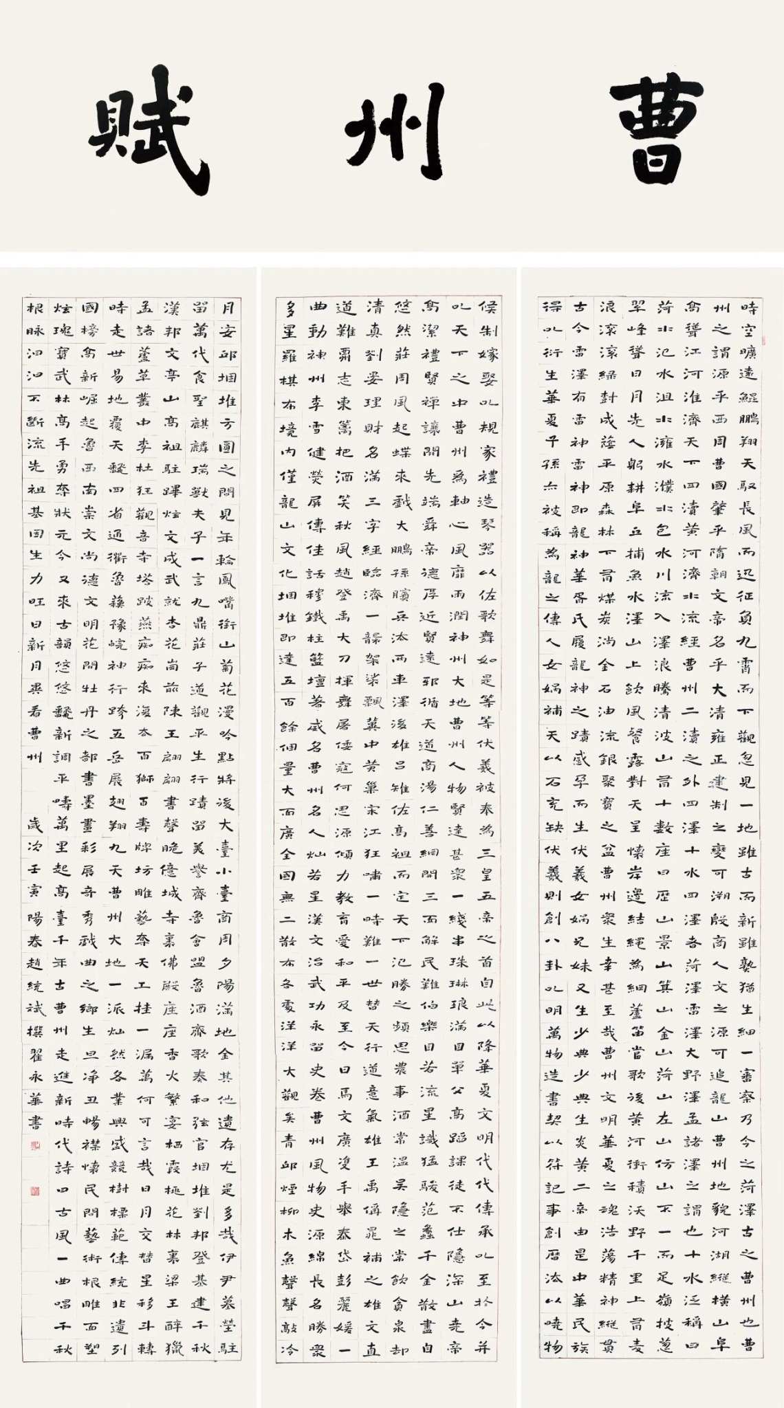 大美之作《曹州赋》,美在其文学之风采,美在其书法之气韵,更美在曹州这片古老而丰厚的土地,因其人杰地灵,方成就了今天的作家和书法家,方成就了我们看到的《曹州赋》。