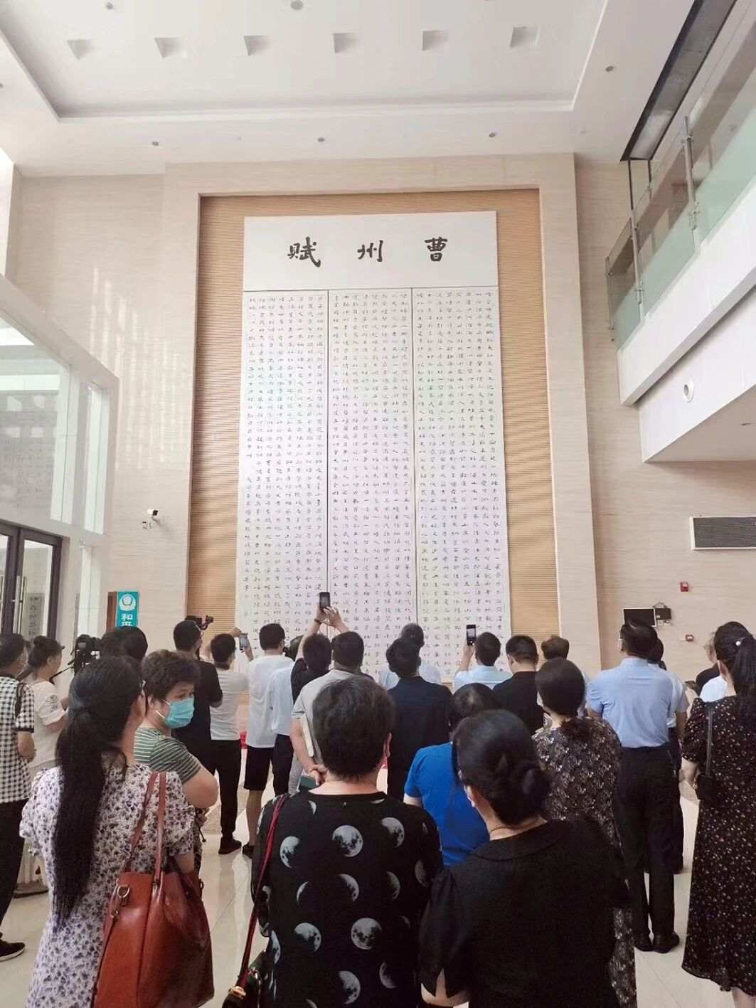 此《曹州赋》乃指悬挂在菏泽市图书馆南门大厅的巨幅书法作品——由菏泽市作家协会主席赵统斌撰稿,菏泽市书法家协会主席翟永华书写。作品高8.2米,宽4.6米,大气磅礴,蔚为壮观,实在令人震撼。可以说填补了菏泽书法史巨作之空白,更增添了图书馆的文化氛围,达到了兼收传统与现代展陈的交融之美。