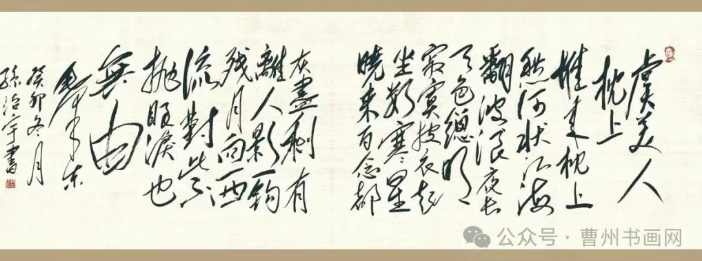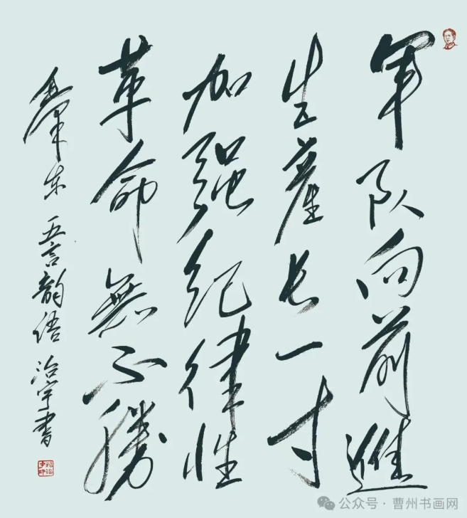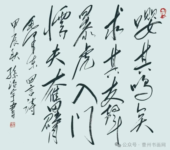 他更让笔墨走出书斋:为庆祝新中国成立75 周年,编著《毛泽东诗词书法作品集》,以毛体书写 58 首毛泽东诗词,捐赠后建成的 “毛泽东诗词书法展览馆” 免费开放,成为红色文化教育阵地;作品《忆秦娥・娄山关》被中国人民抗日战争纪念馆收藏,《沁园春・雪》被制成邮票发行,成为菏泽文化对外交流的名片。