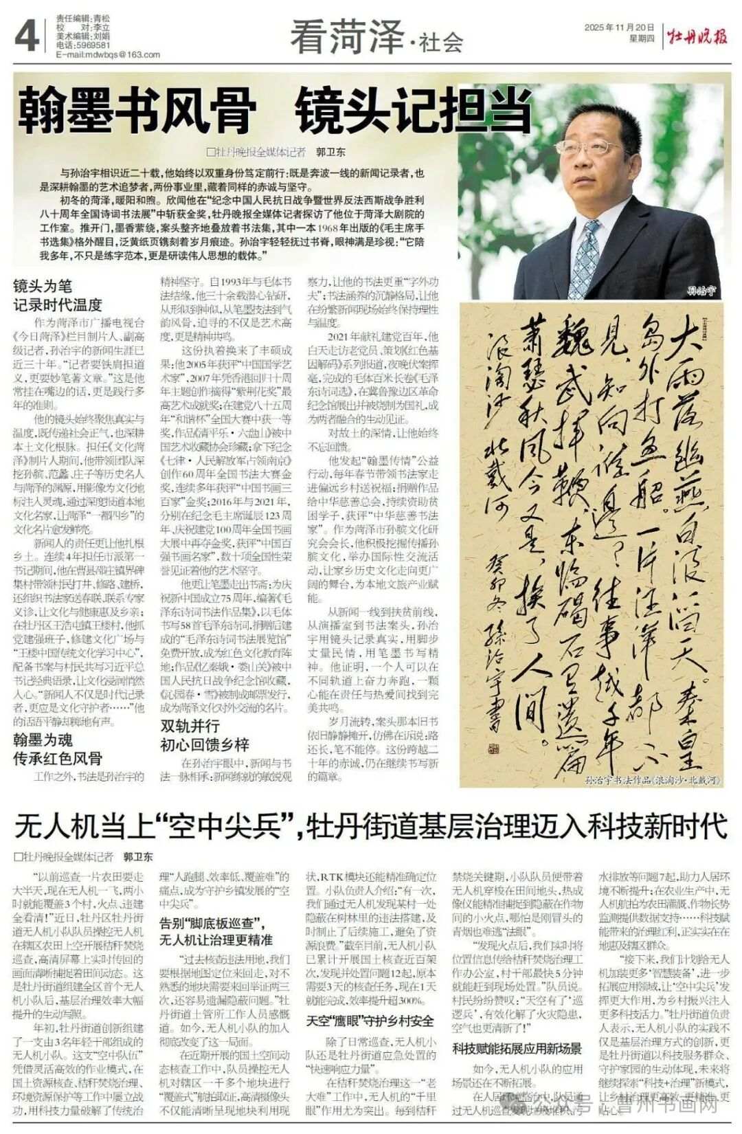 与孙治宇相识近二十载,他始终以双重身份笃定前行:既是奔波一线的新闻记录者,也是深耕翰墨的艺术追梦者,两份事业里,藏着同样的赤诚与坚守。