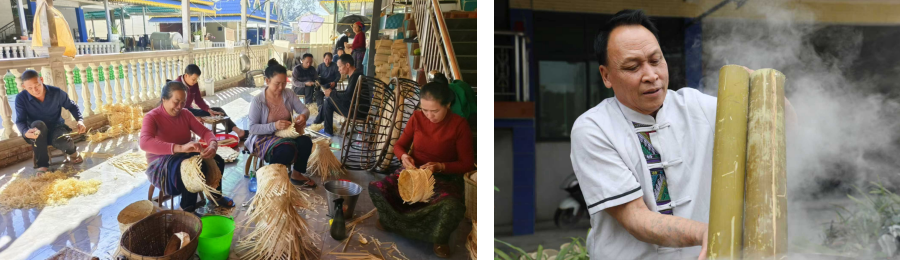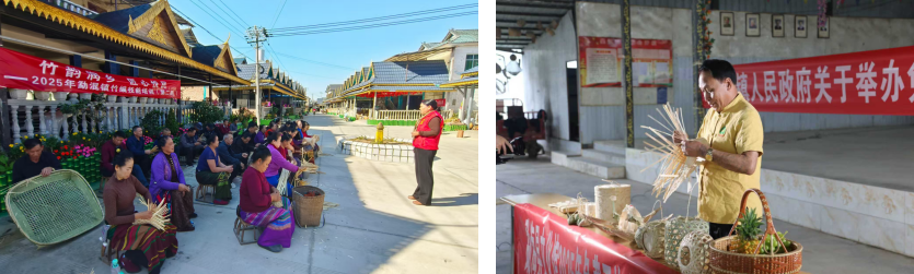 勐混镇傣族竹编技艺历史悠久、工艺精湛,是当地民族文化的重要组成部分,过去,竹编多为家庭自用,年轻人参与意愿低,面临失传风险。勐混镇以党建为抓手,创新“党建+非遗+合作社”模式,由村党支部牵头,联动州级非遗传承人岩稍晚、岩章等人,搭建传习平台、开展常态化培训,手把手向村民传授选竹、破篾、拉丝、编织等竹编技艺,党员带头参与学习、带头传承技艺,形成“党组织引领、传承人主导、村民齐参与”的传承格局,做到非遗技艺有人教、有人学、有人守,让竹编非遗重焕生机。