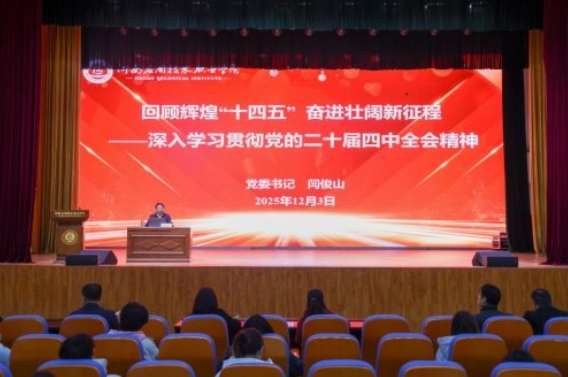 12月3日,河南应用技术职业学院党委书记闫俊山以《回顾辉煌“十四五” 奋进壮阔新征程》为题,为全校师生宣讲党的二十届四中全会精神。党委副书记、工会主席陈君丽及部分师生代表参加现场学习。