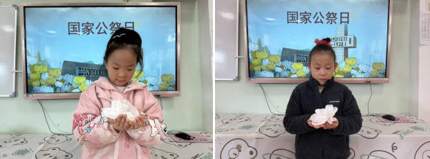 课堂上,教师通过精心准备的视频片段、历史图片和生动讲解,向孩子们娓娓道来国家公祭日的由来:1937 年 12 月 13 日,侵华日军在南京制造了惨绝人寰的大屠杀,30 万同胞惨遭屠戮,国家公祭日的设立,是为了铭记这场民族劫难,缅怀遇难同胞,捍卫民族尊严。孩子们认真聆听红色故事,观看红色影片,主动分享自己了解的英雄事迹。从日军的暴行到先烈的抗争,从苦难的过去到幸福的当下,孩子们逐渐理解了 “家国” 的意义,深刻体会到今日的和平生活来之不易,纷纷表示要珍惜粮食、爱护家园,以实际行动感恩先烈、致敬祖国。