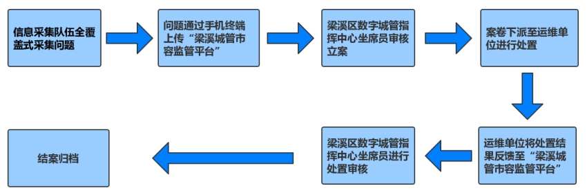梁溪区城市运维体系建设,按照“信息采集—平台核实—流转下派—处置闭环”的一体化运维模式推进。由专职信息采集队伍对“龟背壳”区域内城市硬件设施进行全覆盖式巡查采集,问题案卷通过“梁溪城管市容监管平台”交办至相关运维单位,由运维单位在处置期限内完成处置反馈平台。