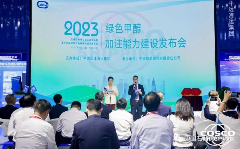 本网讯(臧玉兴)9月25日下午,在全球可持续交通高峰论坛暨第十五届国际交通技术与设备展览会上,中远海运集团旗下核心航运服务企业中国船舶燃料有限责任公司(简称中国船燃)召开“绿色甲醇加注能力建设发布会”。