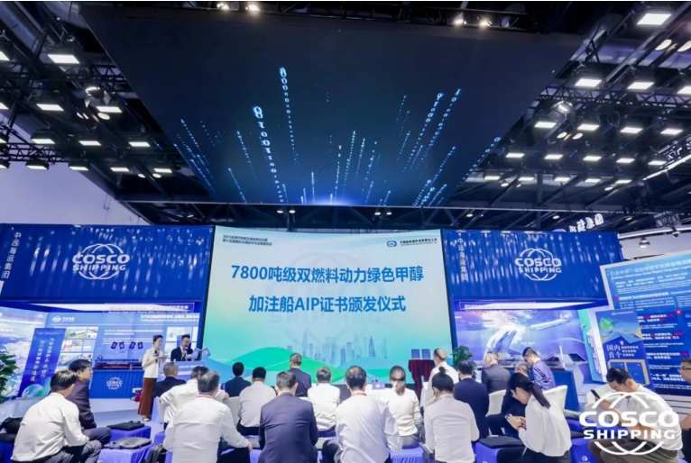 会上,中国石油流通协会和中国出入境检验检疫协会分别宣布了由中国船燃牵头发起的《船用甲醇燃料水上加注规程》《船用甲醇燃料》两个团体标准正式发布,并由中国船级社(CCS)和必维船级社(BV)为中国船燃、中远海运重工等分别颁发7800吨级双燃料动力绿色甲醇加注船原则性认可证书(AIP证书)。