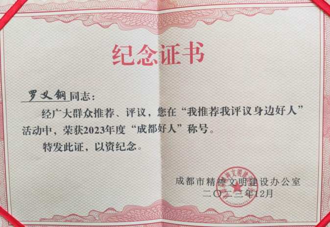 经广大群众推荐、评议,金堂县第二人民医院呼吸内科/老年病科主任、内科第一党支部书记罗义钢在“我推荐我评议身边好人”活动中被成都市精神文明建设办公室评为2023年度敬业奉献类“成都好人”,并于3月5日参加了颁奖仪式。