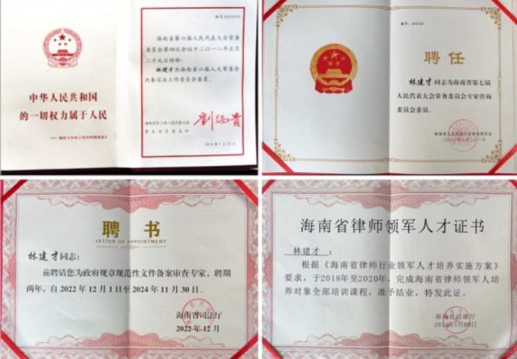 难能可贵的是,林建才律师还身兼多个社会职务。他是海南省人大常委会专家咨询委员会委员 、海南省委联系服务重点专家、海南省政府规章规范性文件备案审查专家 、海南大学法学院校外法律实务指导老师、海南科技职业大学讲师、海南省第八届律师协会副监事长、海南省六届人大常委会内务司法工作委员会委员,并获得海南省委、省政府“法律进乡村工程先进个人”、第八届西部律师发展论坛征文二等奖 、中南六省(区)律师论坛优秀论文一等奖(2018)、海南省律师行业“优秀党务工作者”、海南省司法行政系统“优秀共产党员” 、海南省律师领军人才、海南省涉外法律人才等诸多荣誉。