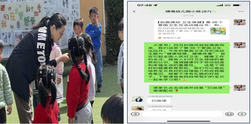 幼儿园通过国旗下讲话、公众号、微信群等形式对爱国卫生运动进行广泛宣传,面向全体教师、幼儿、家长等社会群体发出倡议,倡导健康、科学、文明的生活方式,呼吁大家一起行动起来。