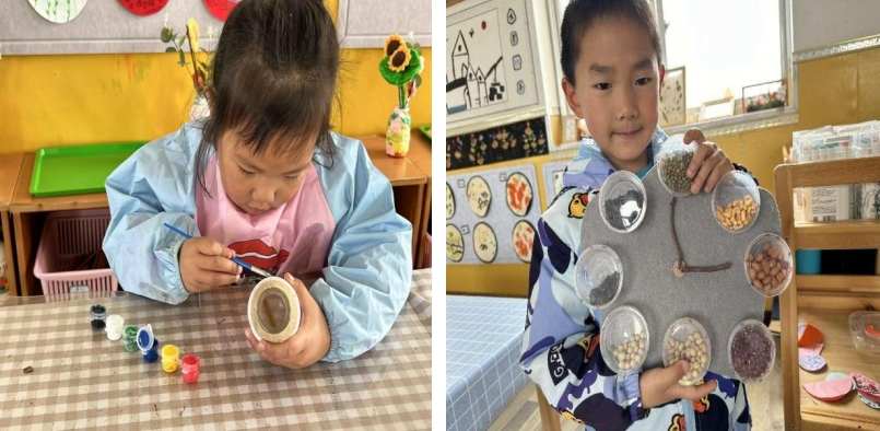 动动我们的小巧手,垃圾也能变成宝。废旧的纸板粘贴各种种子就变成了一面时钟;几根玉米棒拼搭在一起就变成了一匹可爱的小马……这些废旧材料的创意利用,不仅提高了幼儿的动手能力,同时也增强了幼儿珍惜资源、勤俭节约的环保意识。