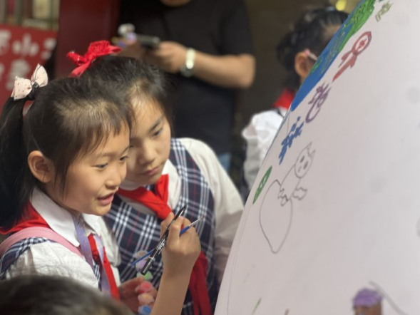 “环保涂鸦”环节,队员们或立、或坐、或俯、或卧,以天真童趣的自由表达、天马行空的瑰丽创想,尽情挥洒手中的画笔,描绘自己心中的“绿色地球”。