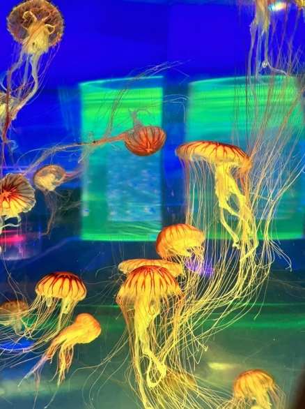 珊瑚水母馆中,五颜六色的大型珊瑚塔,成千上万只空灵摇曳的水母,绚烂多彩的珊瑚族群为同学们揭开了一场恢弘壮丽的视觉交响,幻化出一幅幅自由恣意的美景。