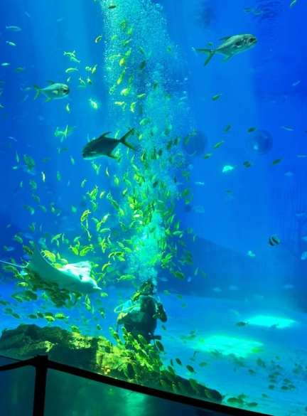 走进海底世界馆,同学们仿佛置身于充满童趣和梦幻色彩的未来世界,借助全球顶尖的科技手段,各类海底生物都加入这趟海底之旅。同学们目睹色彩斑斓的尖吻魟、珍珠龙胆石斑鱼等群游鱼类以及五颜六色的珊瑚礁鱼群自在游弋,尽览海底世界的静谧与雄奇。