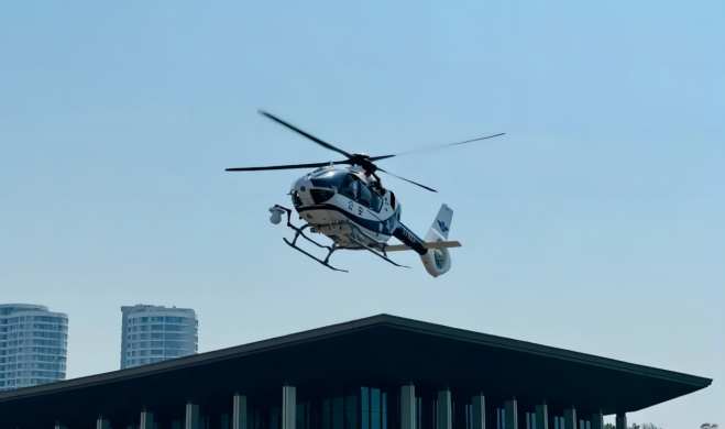 大鹏展翅,长空万里。随着旋翼的加速转动,青岛公安37023警用直升机平稳离地升空,机组人员为群众带来飞行性能展示,在一系列复杂而精确的操纵下,水上悬停360度原地转弯、左右侧飞、大坡度8字转弯、大速度通场,悬停静若处子、飞行动如脱兔,将启动仪式推向高潮,现场群众对机组人员熟练精湛的飞行技术赞叹不已。