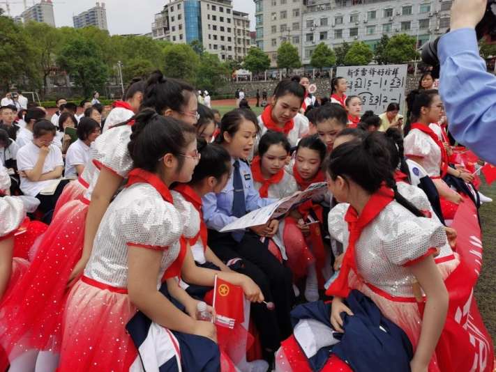 (图为洞口县禁毒办民警为城关中学小演员们讲解禁毒知识)