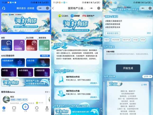 为此,国贸地产跨界联动QQ 音乐,通过QQ音乐领先的AI模型,邀请全民一起参与互动。只要登录QQ音乐活动专属小程序“腾讯音乐·启明星”,输入简单关键词和曲风喜好等,就可以利用AI 生成有关“海洋”的个性化旋律与歌词,打造专属公益歌曲并在线分享。同时,即时生成的内容还将被系统抓取进入词曲库,国贸地产将在此基础之上,制作完成一首属于全民共创的AI海洋公益主题曲。