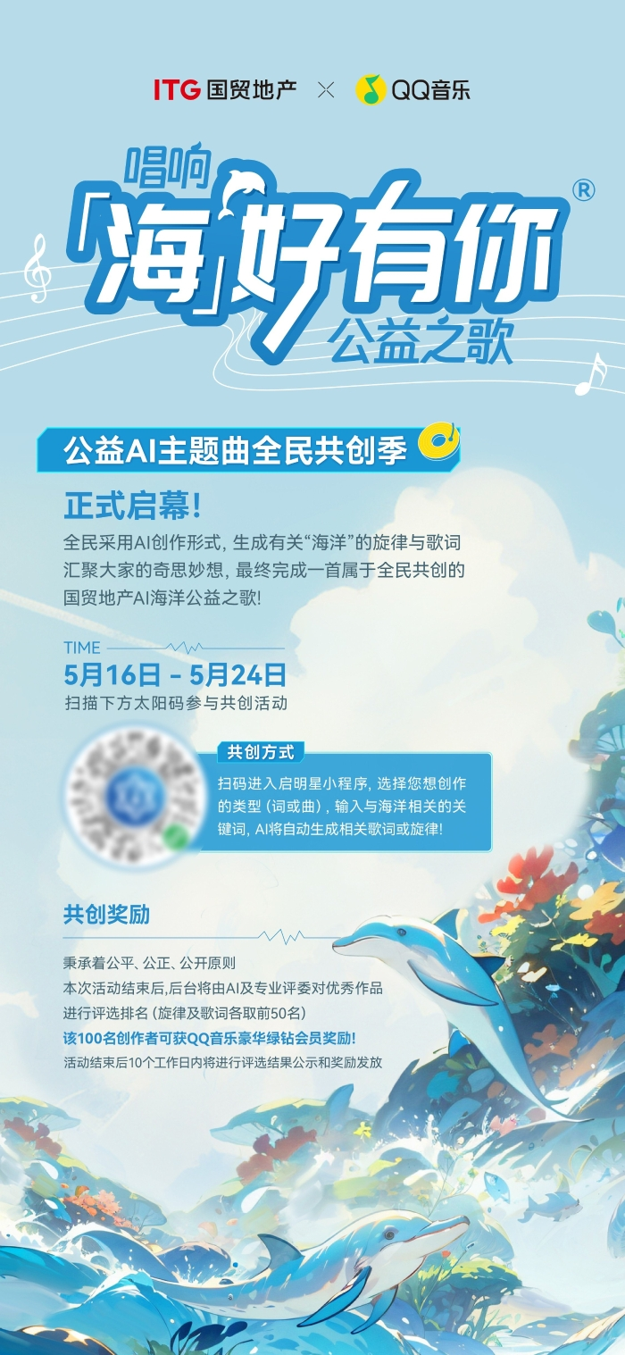 5月16日,作为国贸地产海洋公益月重要活动之一,由国贸地产携手QQ音乐举办的“海好有你 国贸地产公益AI主题曲全民共创季”正式启动。登录线上专属平台进行海洋公益词曲AI创作、分享,并基于共创内容定制一首主题曲全网发布……