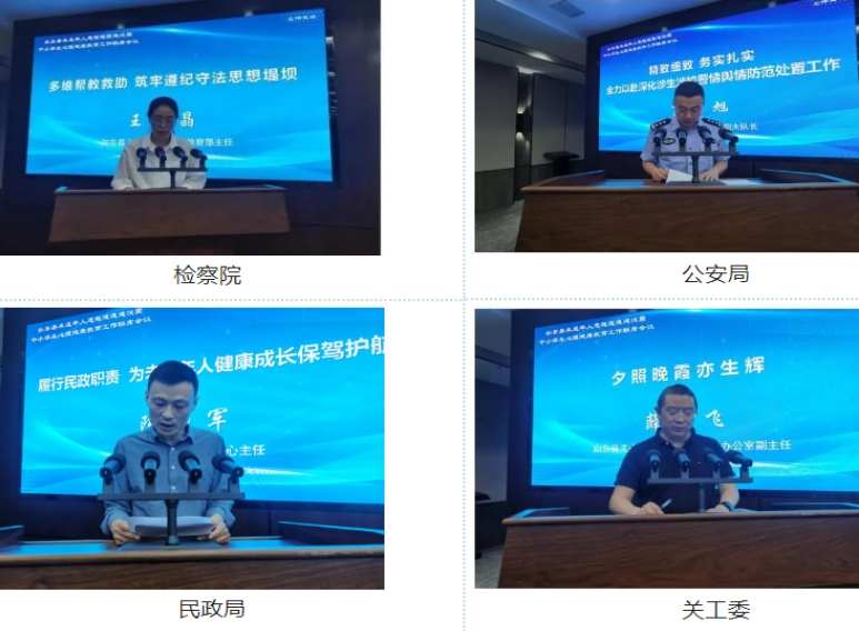 会上,检察院、公安局、民政局、关工委、丰利镇、大豫镇等6家单位做了工作交流。