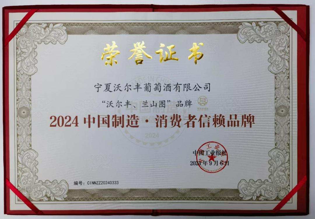 日前,由中国工业报社举办的“2024(第二届)中国制造·消费者信赖品牌推介活动”结果正式揭晓。宁夏沃尔丰酒庄的“沃尔丰、兰山图”品牌凭借在创新能力、品牌影响力、品控能力等方面的突出表现,在全国近百家候选品牌中脱颖而出,荣获“2024中国制造·消费者信赖品牌”荣誉称号。