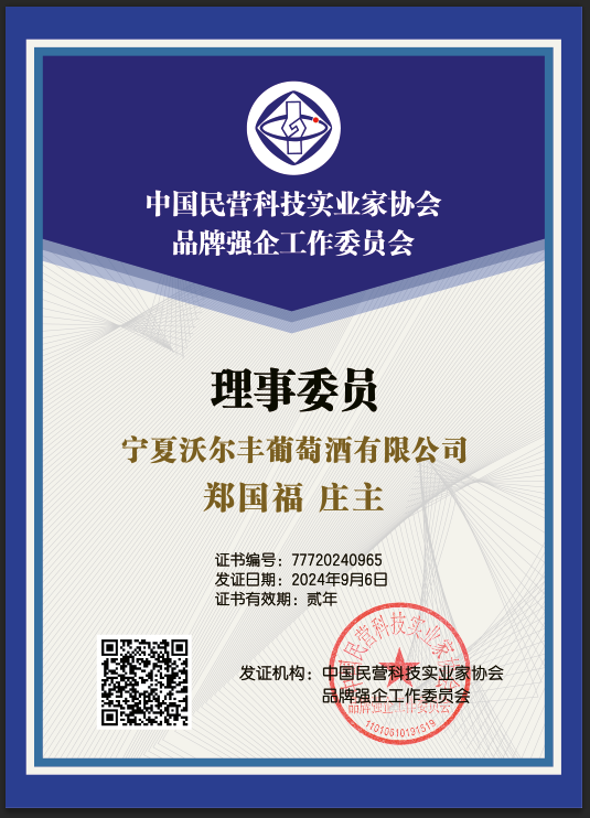 沃尔丰酒庄用品质铸造品牌,布局百年基业。2021年9月,酒庄被宁夏贺兰山东麓葡萄与葡萄酒国际联合会评定为“贺兰山东麓葡萄酒产区四级列级酒庄”;2021年11月,沃尔丰酒庄被自治区科技厅评定为“自治区科技型中小企业”;2022年3月,国家知识产权局核准酒庄使用“贺兰山东麓葡萄酒”国家地理标志;2022年11月,酒庄被银川市旅游景区质量等级评定委员会评定为“国家AAA级旅游景区”;2022年12月,被银川市绿化委员会评定为“林韵酒庄”;2024年1月,酒庄酿酒师团队获得中国酒业“匠心集体”“工匠之星”荣誉;2024年1月9日,荣登“2024胡润中国葡萄酒庄50强”榜单,成为贺兰山东麓综合实力较强的精品酒庄之一。