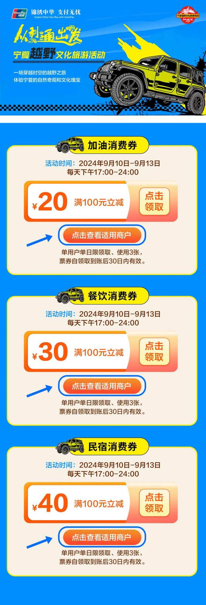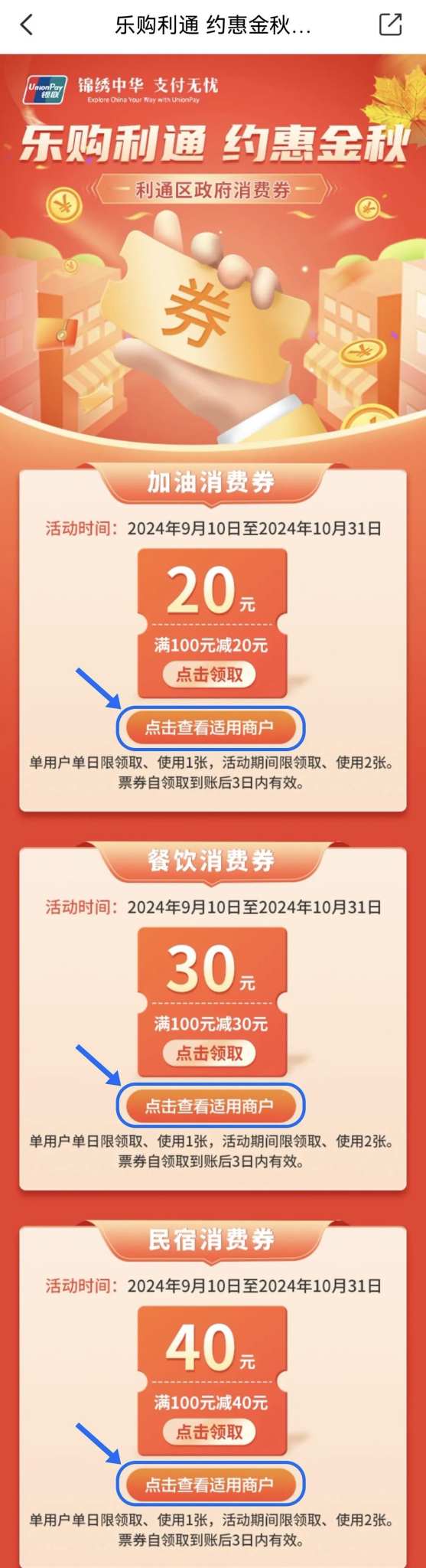 为满足不同消费群体的需求,此次活动设置了不同种类不同面额的消费券,其中加油消费券满100元减20元、餐饮消费券满100元减30元、民宿消费券满100元减40元。2024年9月10日-10月31日期间,利通区群众可通过云闪付APP“乐购利通 约惠金秋”利通区政府消费券专区领取。领取后在参与活动商户购买指定商品消费结账时,出示云闪付付款码或扫描商户二维码即可享受消费满减优惠。单用户单日限领取、使用1张,活动期间限领取、使用2张,票券自领取到账后3日内有效。
