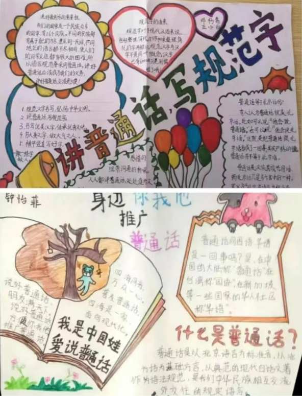 五年级同学制作了精美的手抄报表达自己对祖国语言文字的热爱,从小做起,从我做起,大力推广普通话,使普通话成为校园语言、生活语言。