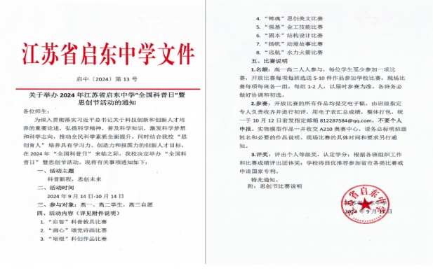 启动仪式上明确了今年“全国科普日”暨思创节活动的相关要求。活动主题为:科普新程,思创未来。活动时间从 9 月14日到10月14日,持续一个月。活动内容除常规的课程、宣传和讲座外,还包括“启智”科普教具比赛、“润心”颂党诗画比赛、“培根”科创作品比赛、铸魂”思创美文比赛、“强基”金工技能比赛、“固本”结构设计比赛、“扬帆”动漫故事比赛和 “远航”水力火箭比赛等。