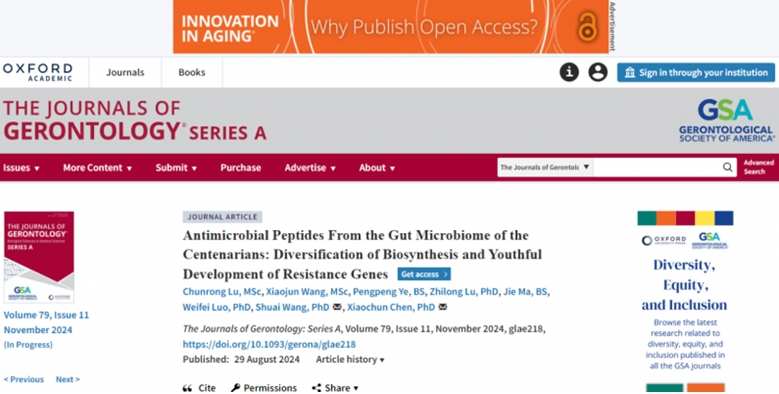 近日,国际知名学术期刊《The Journals of Gerontology, Series A: Biological Sciences and Medical Sciences 》(老年学系列期刊A-生物科学与医学科学)刊发了来自广西爱生生命科技有限公司(以下简称爱生生命)科学家团队的论文,论文题为《Antimicrobial Peptides From the Gut Microbiome of the Centenarians: Diversifcation of Biosynthesis and Youthful Development of Resistance Genes》(百岁老人肠道微生物组中的抗菌肽:多样化的抗菌肽生物合成和年轻化的抗性基因发展)。
