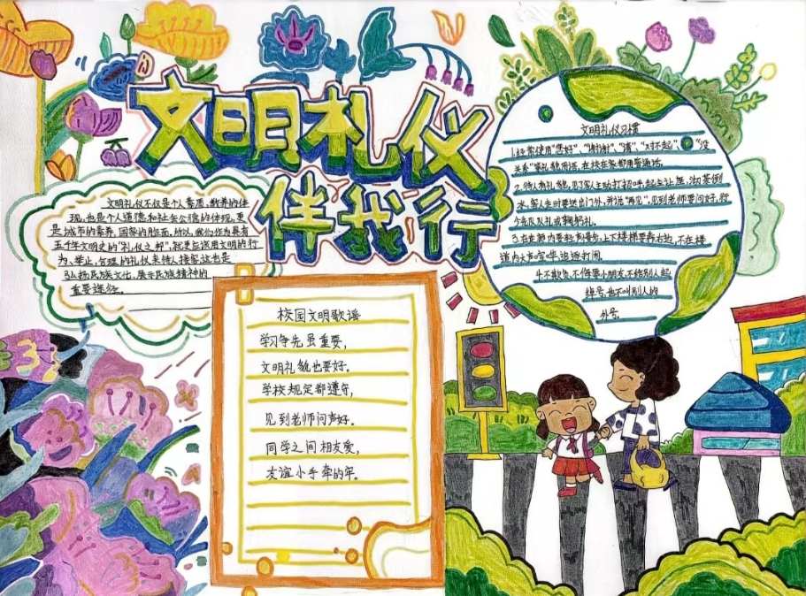同学们通过主题黑板报、手抄报、绘画等形式展现了对文明礼仪的认知、理解,用行动提醒大家时刻做一个知礼、明礼、懂礼的新时代好少年。