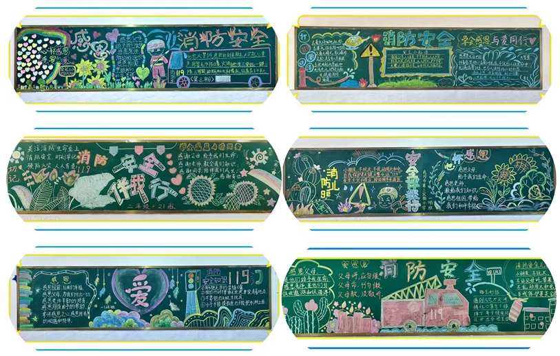 评比人员深入各班级查看黑板报内容。各班级以生动图画展现了火灾危害,用简洁的文字介绍了预防火灾的要点,同时,用温馨的插图配以真挚的文字,表达对父母、家人、老师的感恩之情。