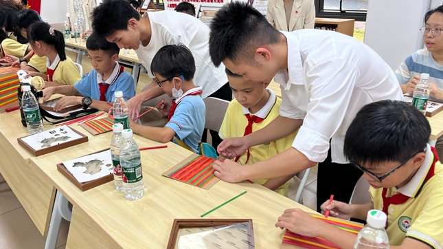 在“大手拉小手,非遗竹编手工体验”环节,大学生与小学生一对一结对,共同参与了非遗竹编的制作。在学生党员的耐心指导下,小学生们认真学习竹编技艺,从选材到编织,每一步都充满了乐趣和挑战,共同完成了一个个以爱国为主题的竹编作品。体验环节不仅展示了大学生们的巧手和智慧,一穿一压中更传递了广东建设职业学院作为现代鲁班摇篮的校园文化,大学生、小学生在拉手共建活动中,共同感悟劳动精神、劳模精神、工匠精神。