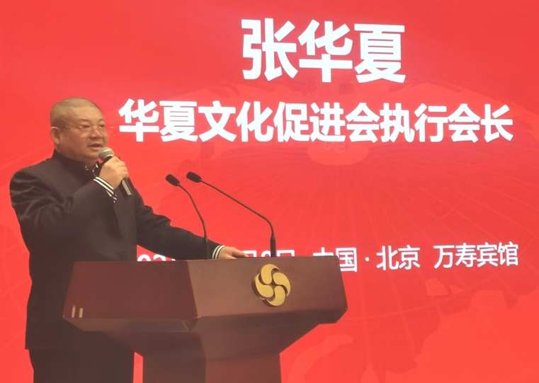 华夏文化促进会执行会长张华夏,在主席台上作主旨讲话。
