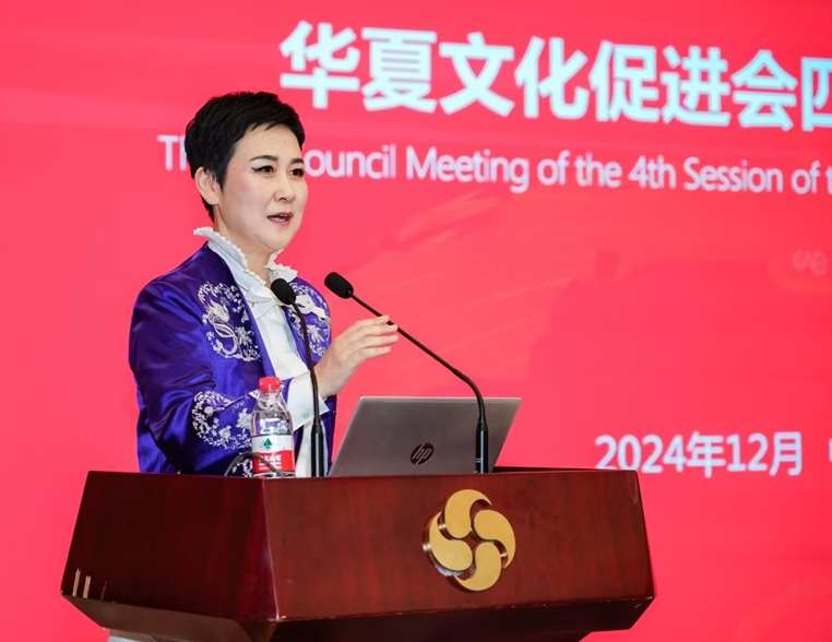 新当选的华夏文化促进会会长李小琳,在主席台上发表感言。